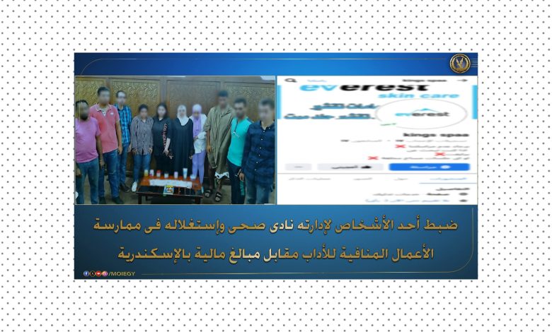 قيام (أحد الأشخاص “له معلومات جنائية”) بإدارة نادى صحى “بدون ترخيص” كائن بدائرة قسم شرطة أول #المنتزه #بالإسكندرية وإستغلاله فى ممارسة الأعمال المنافية للآداب العامة لراغبى المتعة مقابل مبالغ مالية وبدون تمييز ، والترويج لنشاطه عبر إحدى الصفحات بمواقع التواصل الإجتماعى.