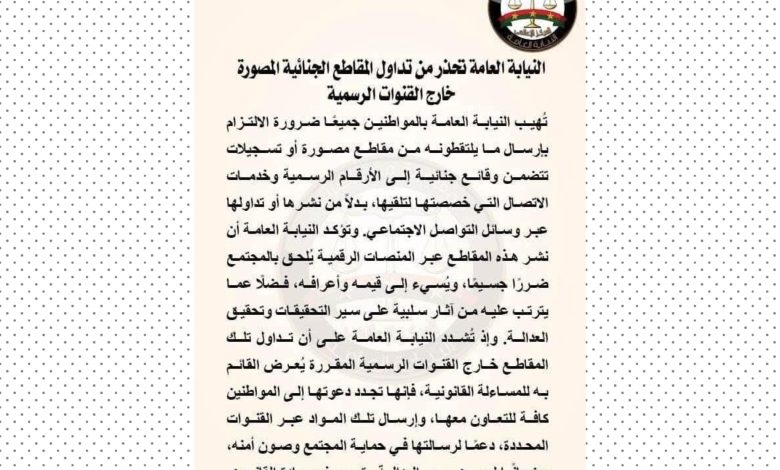 النيابه العامه تحذر من تداول المقاطع الإجرامية المصورة خارج القنوات الرسميه للدوله