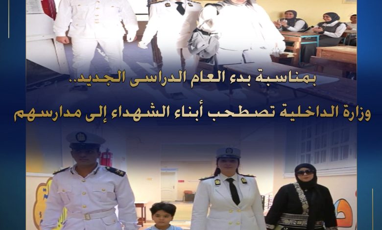 وتزامناً مع اليوم الدراسى الأول.. فقد قامت وزارة الداخلية بإيفاد عدد من الضباط والضابطات بمختلف مديريات الأمن لإصطحاب أبناء الشهداء إلى المدارس بمناسبة العام الدراسى الجديد، تأكيداً على أن تضحيات آبائهم الأبطال وسيرتهم العطرة ستظل دوماً وساماً على صدور جميع رجال الشرطة يقتدون به كأروع مثال فى التضحية والفداء.