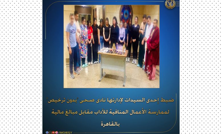 فقد أكدت معلومات وتحريات الإدارة العامة لحماية الآداب بقطاع الشرطة المتخصصة قيام (إحدى السيدات) بإدارة نادى صحى “بدون ترخيص” بدائرة قسم شرطة #التجمع_الخامس بالقاهرة لممارسة الأعمال المنافية للآداب لراغبى المتعة مقابل مبالغ مالية وبدون تمييز.